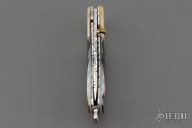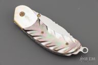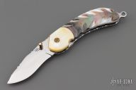 This linerlock by TS Knife features a mirror finished blade with fileworked spine and a single brass thumbstud with diamond inlay. The handle has gold lip pearl bolsters, carved black lip pearl scales, fileworked stainless steel liners and backspacer. Nice detent and blade seating. Excellent condition.