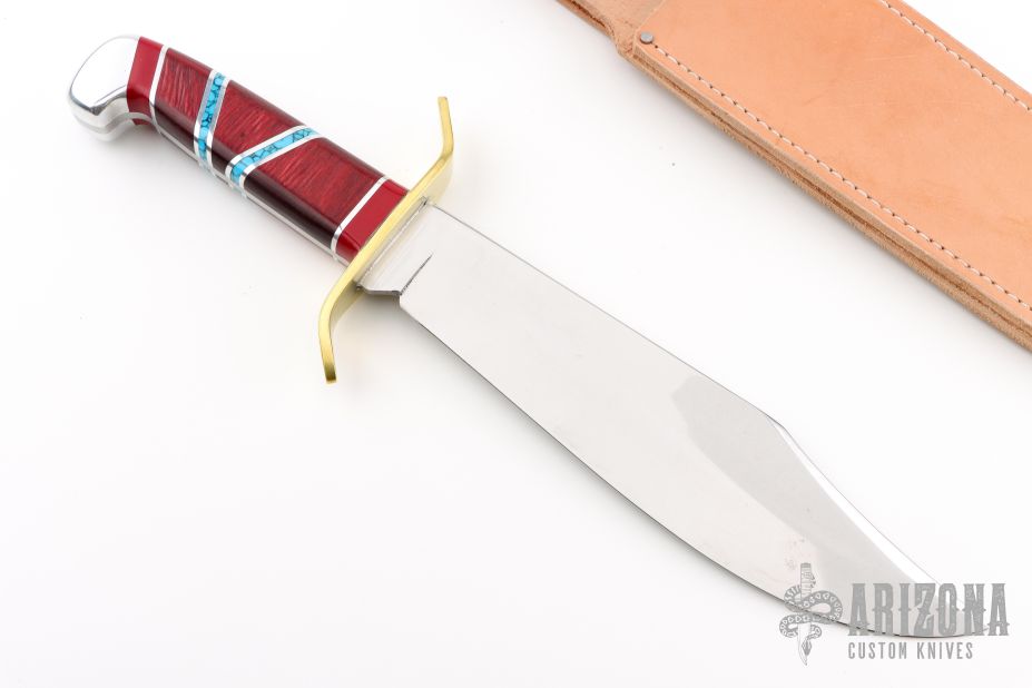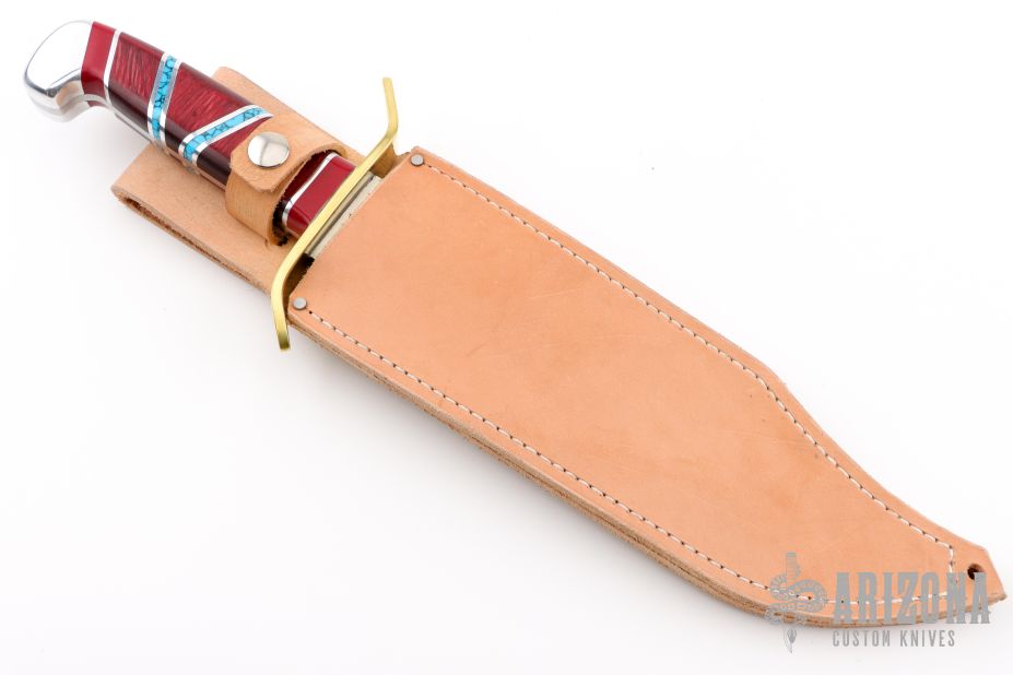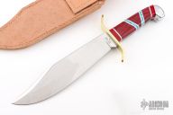 This W49 Bowie by Western Cutlery features a satin finished bowie blade with a false top edge, .166" blade stock and 2.123" blade depth, full tang construction. The handle has a brass s-guard, dymondwood scales with red/aluminum/turquoise spacers, aluminum rear bolsters. Comes with a custom brown leather sheath and original wooden wall display. Has some light scratches, otherwise excellent condition.