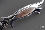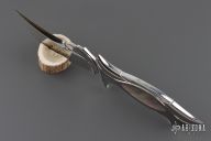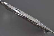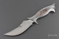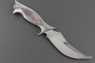 This integral fixed blade from Ron Best features a hollow ground hand rub satin/polished finish blade, with .233" bladestock and 1.533" blade depth, integral construction. There is engraving on the flat sections around the frame, and black lip pearl inlays. False top edge. Beautiful engraving work and inlays. Great feel in the hand. Outstanding work. There are a couple light scuffs and scratches, and the tip is rolled ever so slightly, enough to make mention. Excellent condition otherwise.
