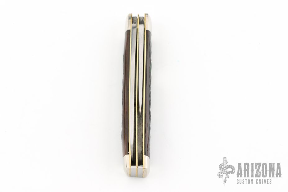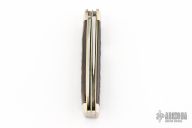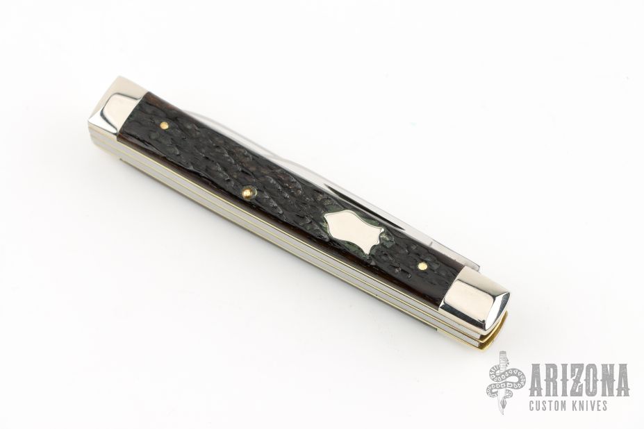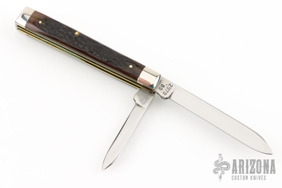 This Winchester folder features two mirror polished blades. Nickel Silver front and rear bolsters with jigged bone covers. Brass liners and steel springs. Original box. Excellent condition.