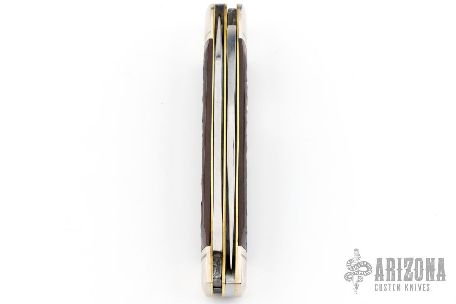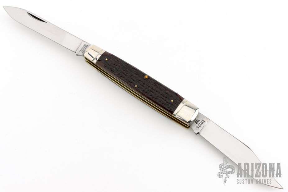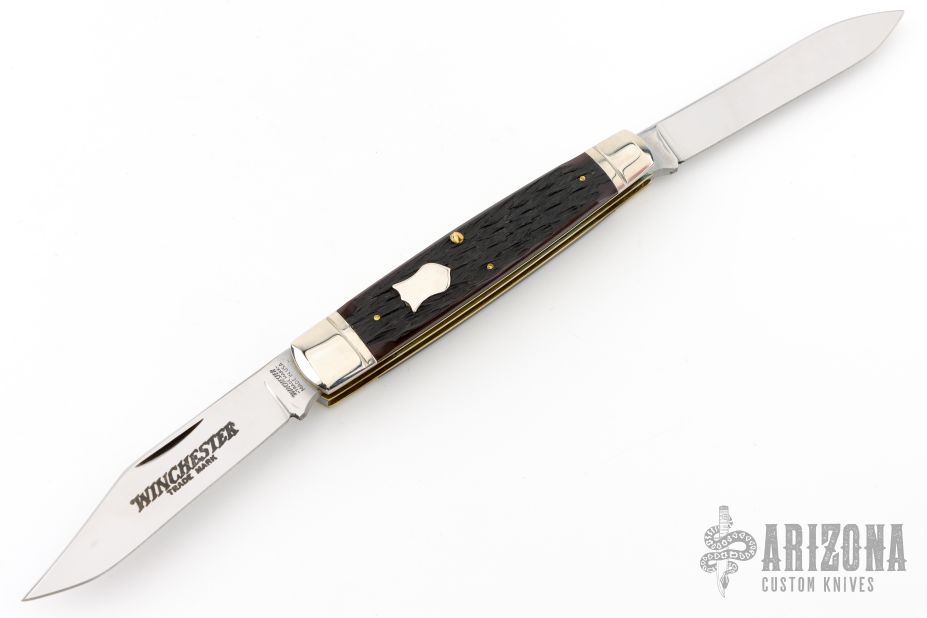 This Winchester folder features two mirror polished blades. Nickel Silver front and rear bolsters with jigged bone covers. Brass liners and steel spring. Original box. Has a couple light scratches, great condition otherwise.