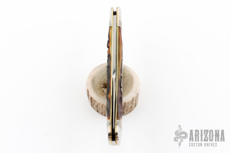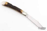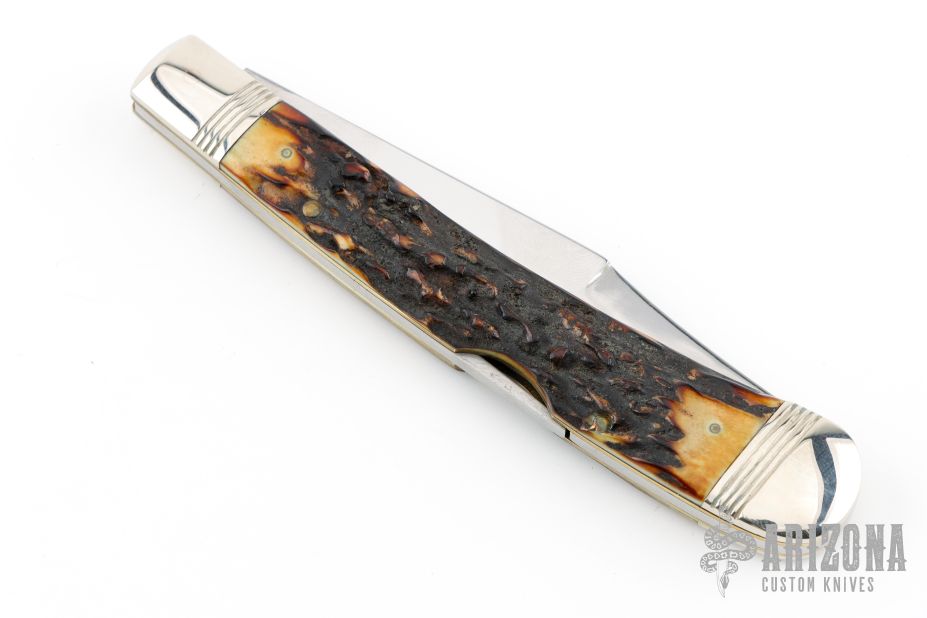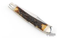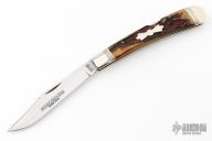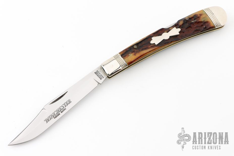 This Winchester folder features a mirror polished blade. Nickel Silver front and rear bolsters with very nice stag covers. Brass liners and steel springs. Original box. Has a couple light scratches, otherwise Excellent Condition.