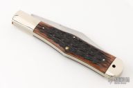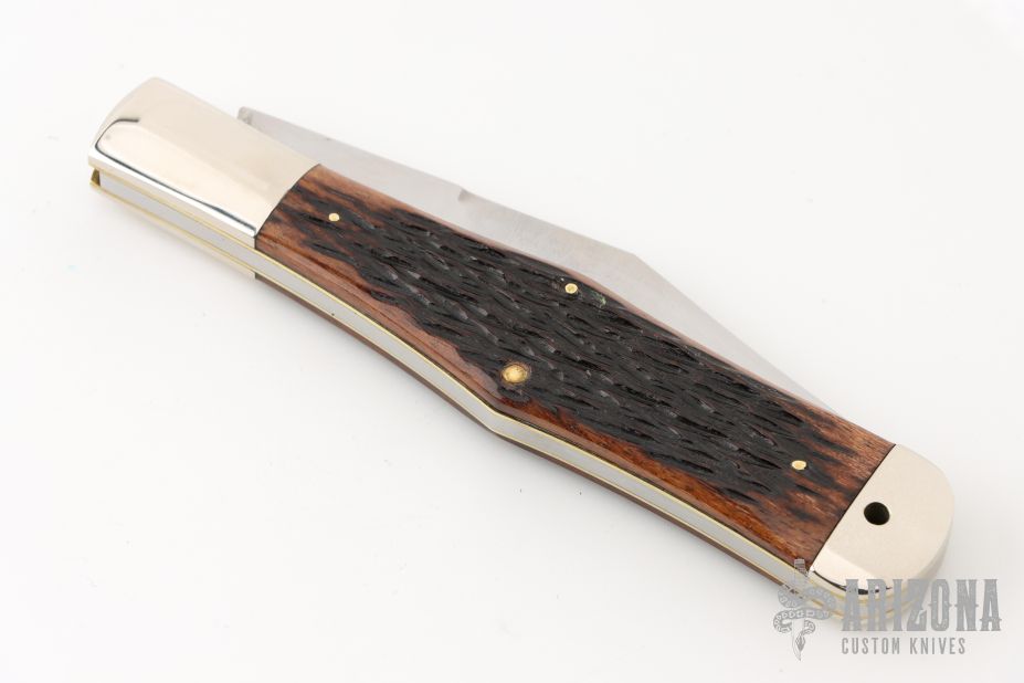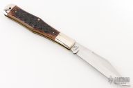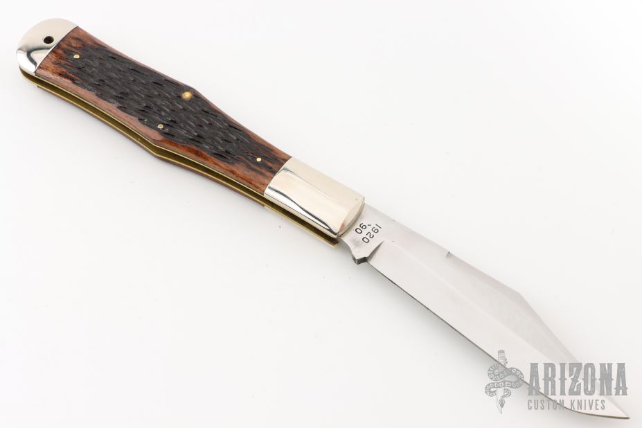 This Winchester folder features a mirror polished blade. Nickel Silver front and rear bolsters with jigged bone covers. Brass liners and steel springs. Original box. Excellent Condition.