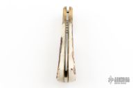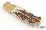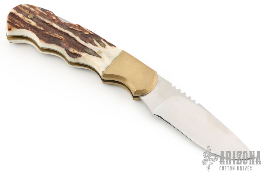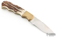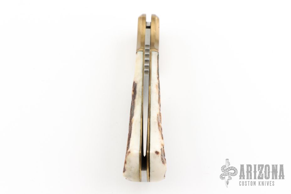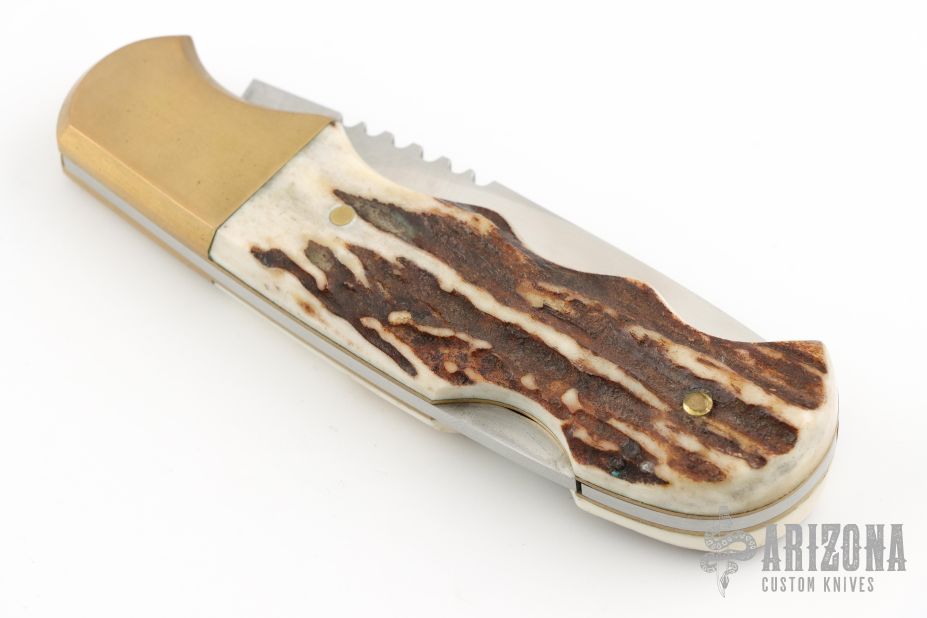 This stunning lockback folder from Seizo Imai features a hand rubbed satin finished clip point blade with notched thumb rest and nail nick. The handle features satin finished brass bolsters with beautiful stag scales, hand peened brass pins, and liners. Comes with a soft pouch. Has a couple light scuffs and scratches, excellent condition otherwise.
