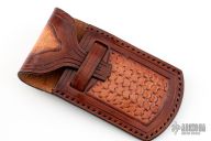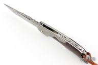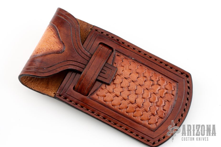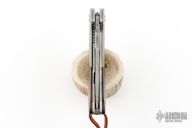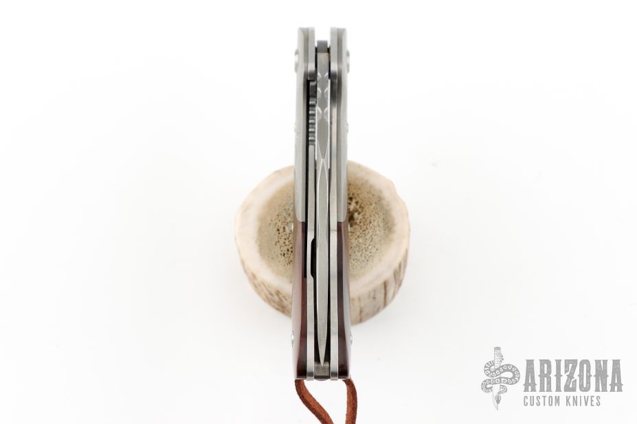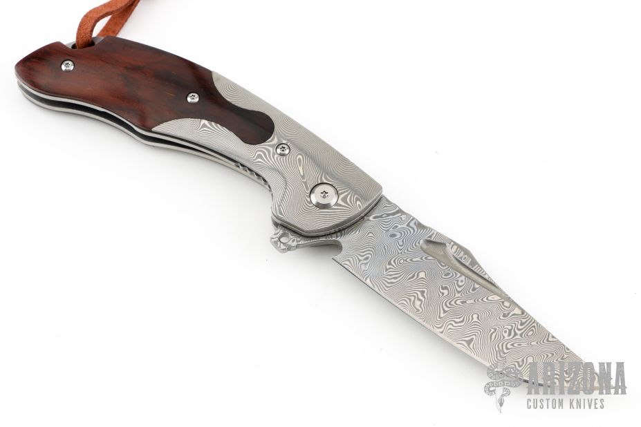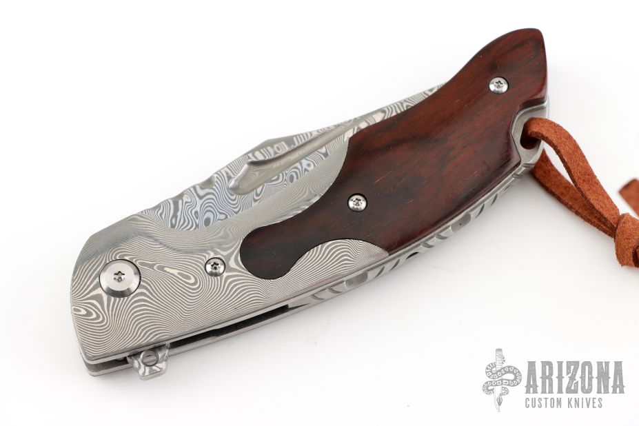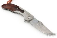 This linerlock flipper by Benjahmin Knives features a Damascus blade with fileworked thumbrest, fullers and a notched flipper. The handle has Damascus keyhole bolsters, rosewood scales, stonewashed stainless steel liners, fileworked stainless steel backspacer with lanyard hole. Rides on bearings, nice detent, lockup and blade seating. Comes with a hand tooled brown leather belt sheath and original box. New from maker.