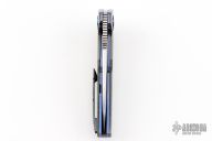 This A2 A6 by Andre Thorburn and Andre Van Heerden features a hand rub satin finished spear point blade with notched thumbrest and flipper. The handle has zirconium bolsters with MokuTi pivot collars, silver lightning strike carbon fiber scales, anodized titanium liners, silver lightning strike carbon fiber backspacer and clip spacer, tip up zirconium clip. Rides on ceramic IKBS. Comes with zippered case and COA. Excellent condition.