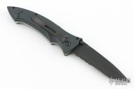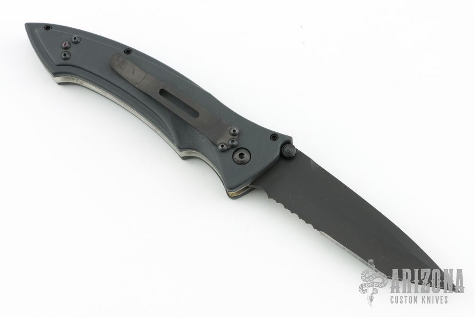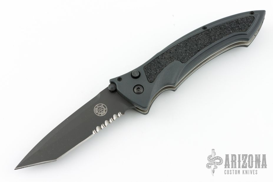 This LTT-875 by Masters of Defense features a black plain tanto blade with false top edge, serrations, and dual thumbstuds. The handle is gray polymer with a tip down black stainless clip, safety on the spine and push button. Includes original box and papers. Has a couple light scuffs, otherwise Excellent condition.