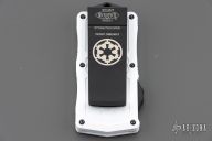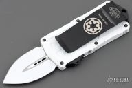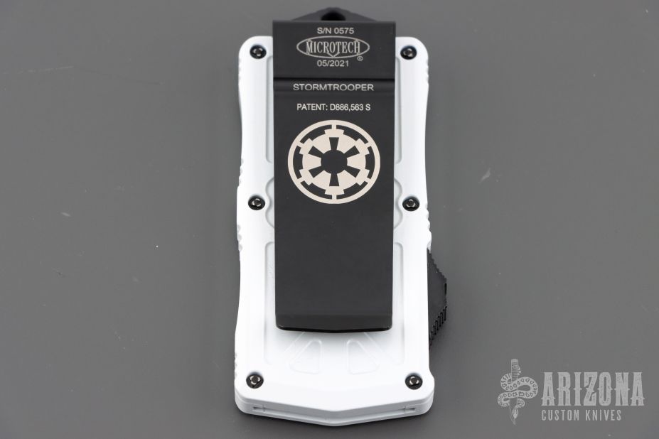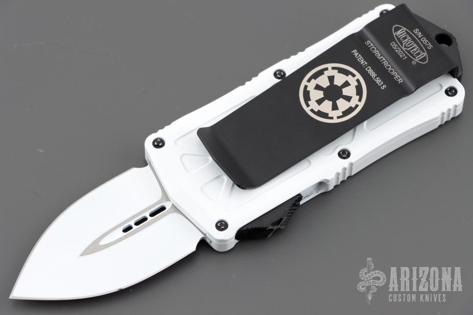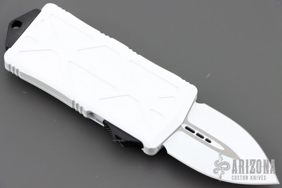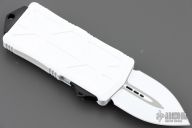 This Microtech Exocet features a white finish tanto clip point blade. The handle has a white aluminum handles and a black stainless clip that doubles as a money clip dated 05/2022 S/N 0575. Comes with original box and papers. Excellent condition.