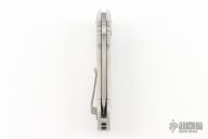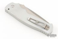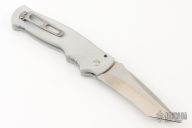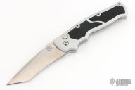 This M2 auto by Walter Brend, features a hand ground satin finished recurve tanto blade with a notched thumbrest.  The handle has a silver aluminum frame with rubber inlays and a tip up steel pocket clip. Comes with original box, papers, and maxpedition case. Excellent condition.
