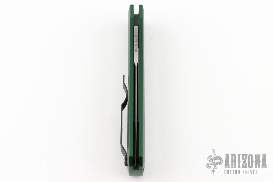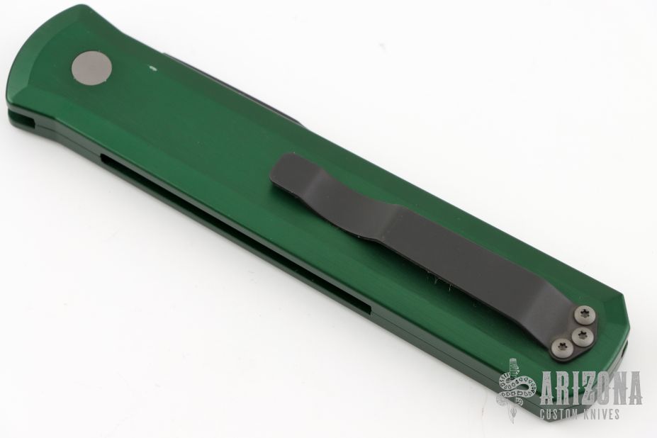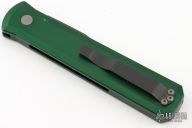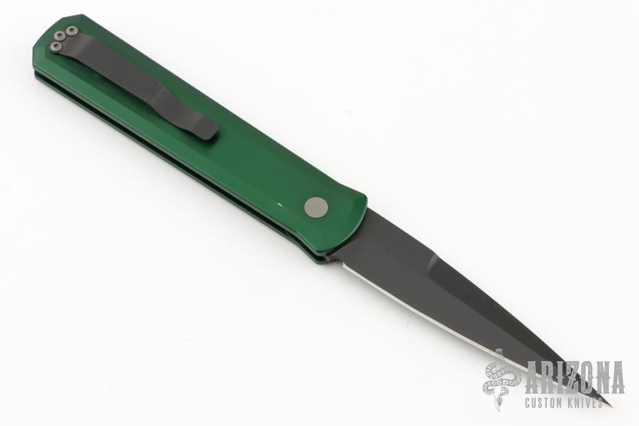 This Godfather features a black dagger style blade (Pro-Tech logo on the blade spine).  The handle has a green aluminum frame with bead blast finshed hardware, push button and black stainless steel tip up clip.  Comes with original box and papers. Has a couple light scuffs and one ding in the frame, excellent condition excellent condition.