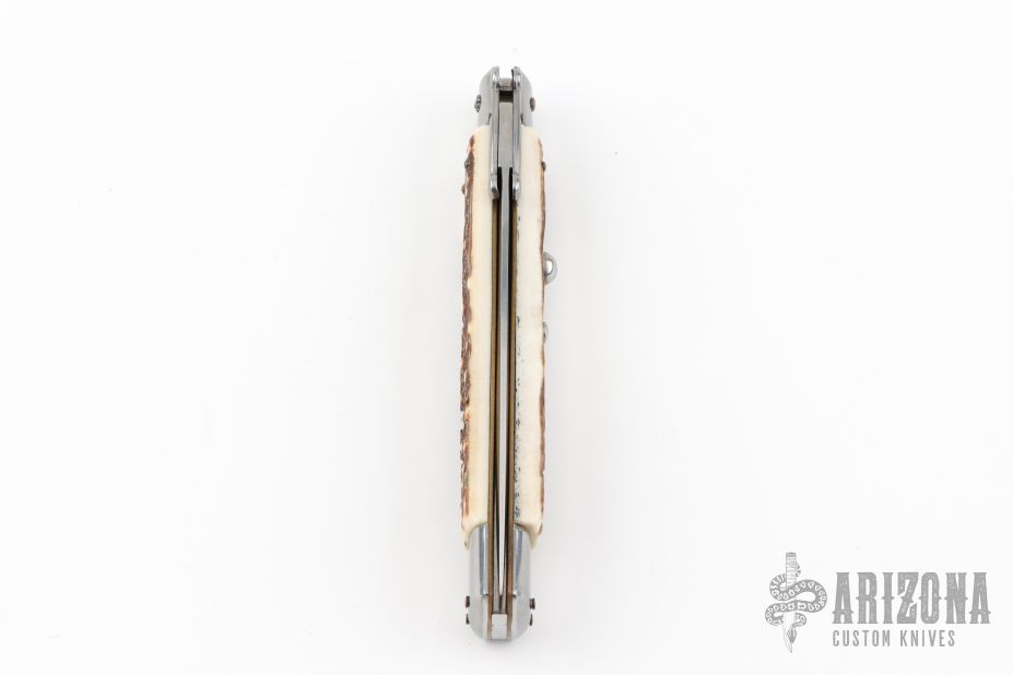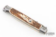 This 11" Swing Guard Auto by Frank Beltrame features a dagger ground blade with false top edge. The handle has stainless steel bolsters, front and rear, stag scales, brass liners, stainless spring. Excellent condition.