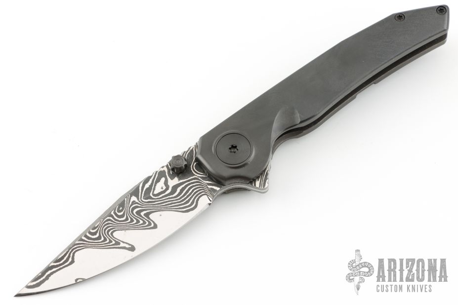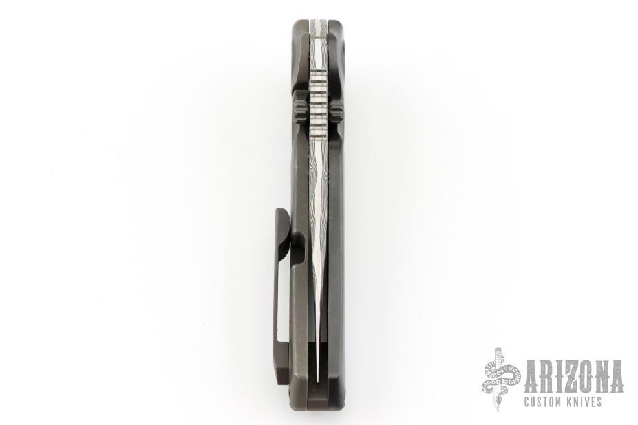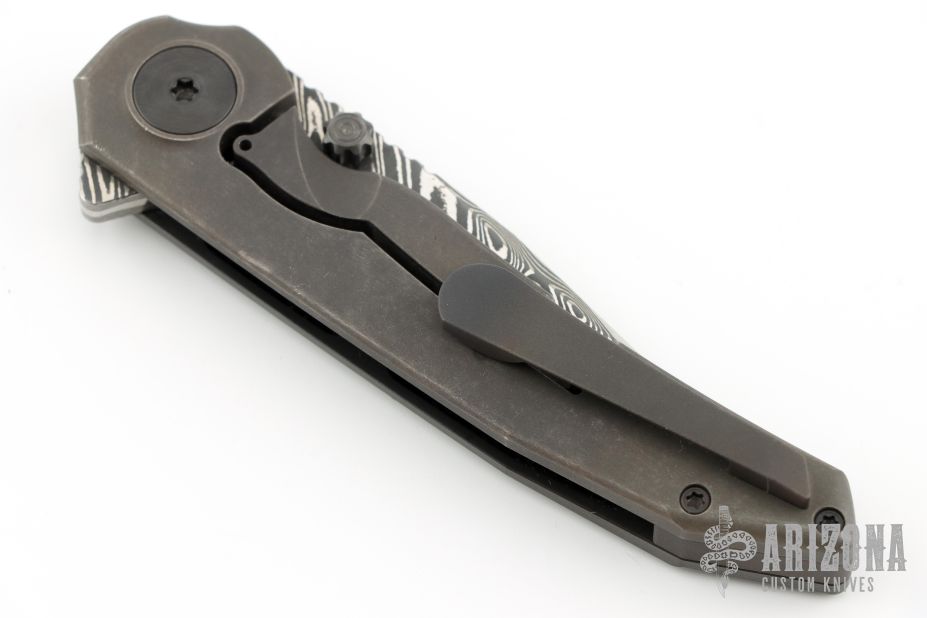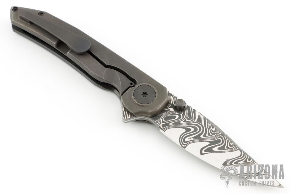 This framelock knife by David Carver/Hypercut features a polished Chad Nichols Armor Core Damascus blade with dual zirconium thumbstuds. The handle has a satin finished zirconium scale, pivot, and acid/tumble finished titanium frame with tip up bead blast finished zirconium clip. Titanium backstrap. Comes with a zipper case, and COA dated May 2024. Nice detent, lockup and blade seating. Has a couple of rub marks on the frame, otherwise excellent condition.