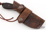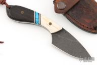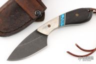 This Skalpr by Vorn Knives features a drop point blade with an acid stonewashed finish, .151" blade stock and 1.364" blade depth, full tang construction. The handle has elk antler bolsters, Gaboon Ebony scales with black liners, black/white/turquosie spacers. Comes with original box, COA and hand tooled brown leather sheath. Excellent condition.