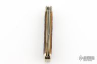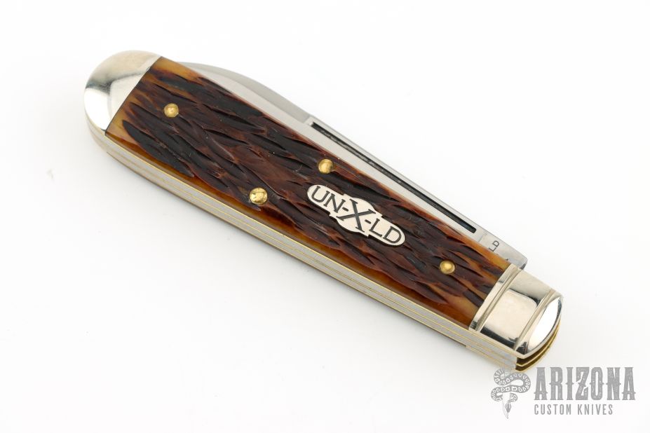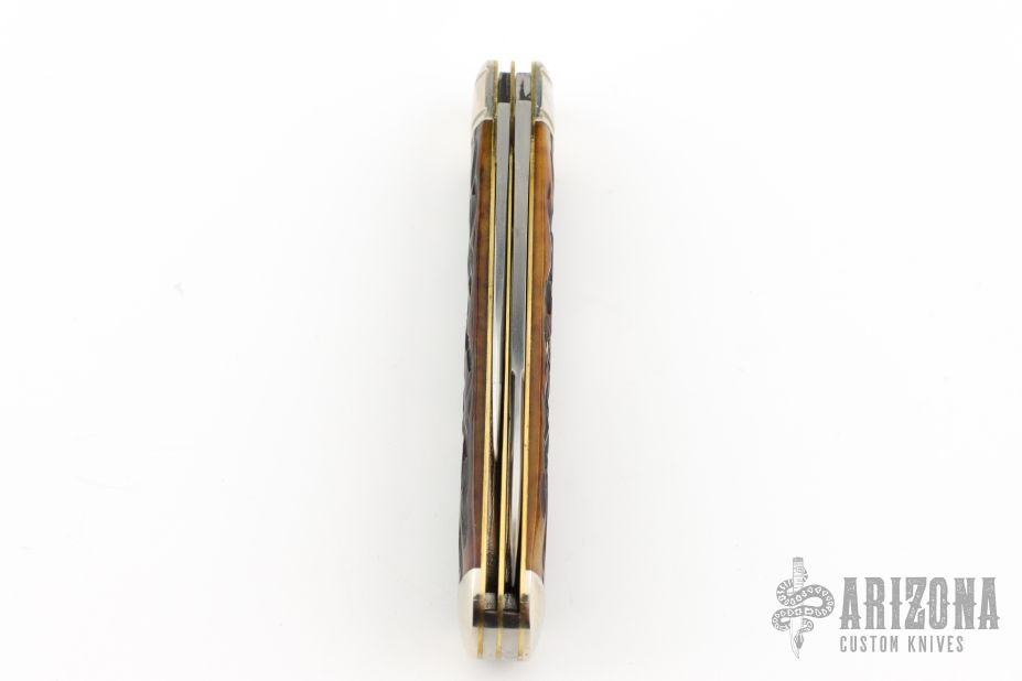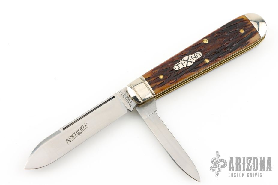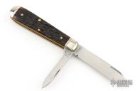 This slipjoint from Northfield features two mirror finished blades with nail nicks. The handle has nickel silver bolsters, jigged yellow bone covers with nickel silver escutcheon over brass liners and steel springs. Has half-stops. Includes original packaging. Has a couple light scratches, otherwise excellent condition.