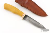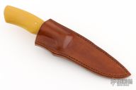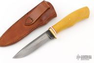 This knife by Ben Mack features a Black Diamond Mill File blade with a hand rub satin finish and nice hamon, .170" blade stock and .956" blade depth, hidden tang construction. The handle has a brass guard, Osage orange grip with a brass pin, red/white G-10 spacers. Includes a brown leather sheath. "2025" on the blade. New from maker.
