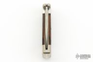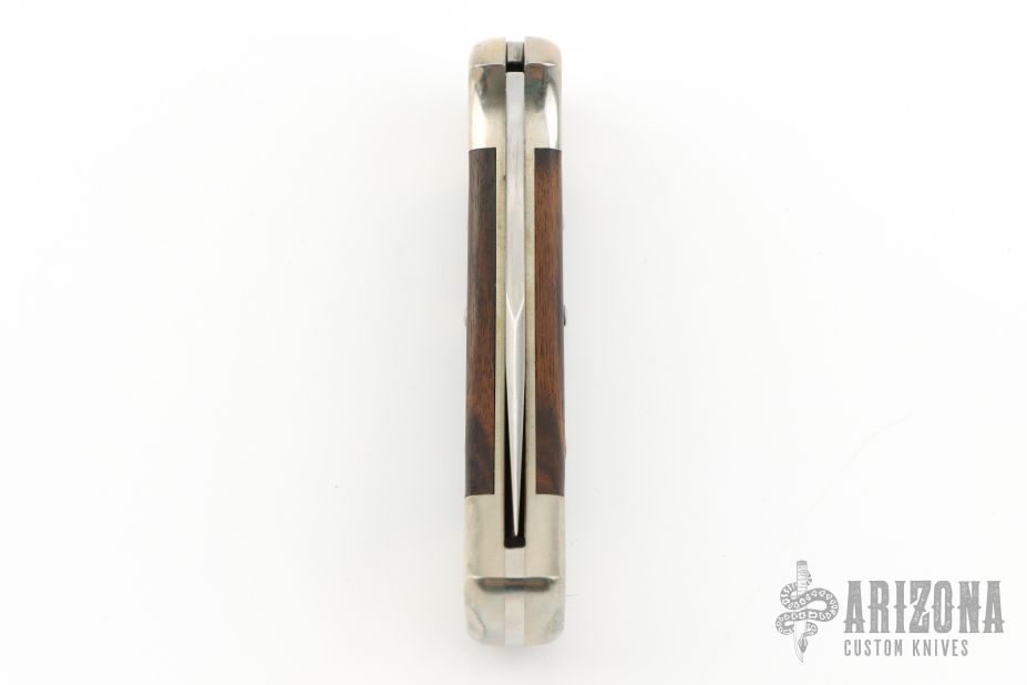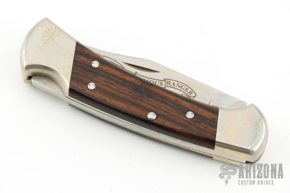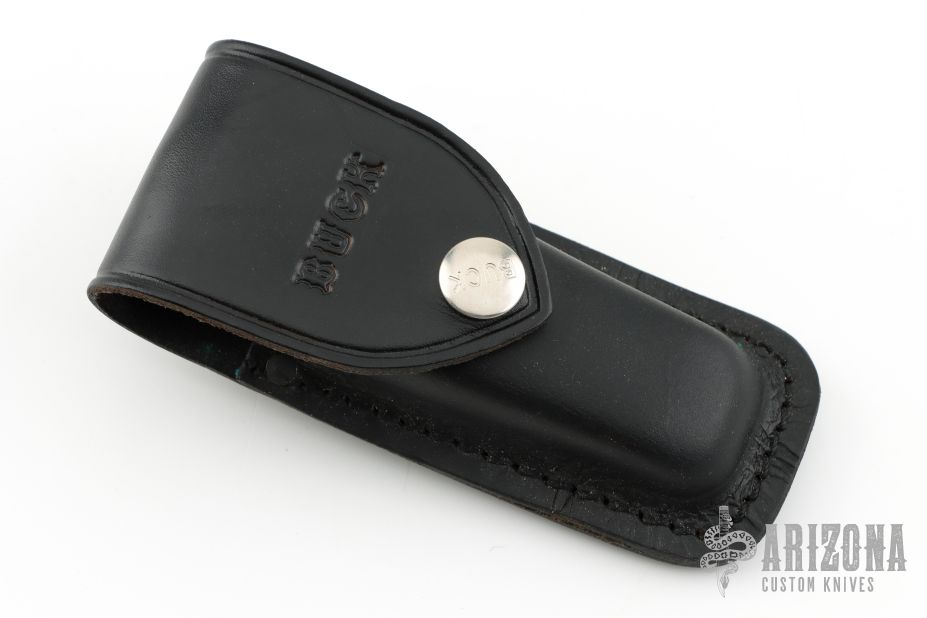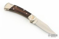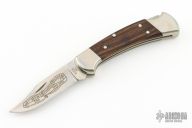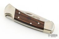 This Buck 112 features a satin finished clip point blade with nail nick. The handle has a nickel silver frame with wood scales and a stainless steel backspacer. Comes with original box, papers, and black leather sheath. Excellent condition.