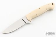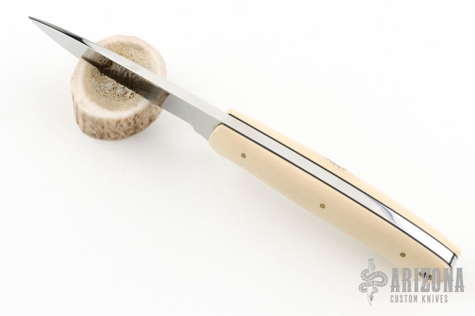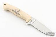 This knife by Dusty Moulton features a mirror finished blade with .188" blade stock and 1.095" blade depth, full tang construction. The handle has white paper micarta scales with black liners. The handle has been scrimshawed by the maker. #9213 on the blade. Excellent condition. Comes with a zippered case.