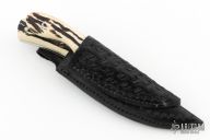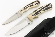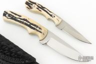 This Piggyback Set by Ross Tyser features a hunter and a caper knife. The hunter has a mirror polished blade with .158" blade stock and 1.067" blade depth, full tang construction. The handle has stag jigged bone scales. The caper has a satin finished blade with notched thumbrest, .119" blade stock and .856" blade depth, full tang construction. The handle has stag jigged bone scales. Both knives fit into a hand tooled black leather sheath. Excellent condition.