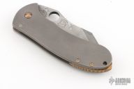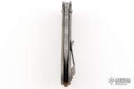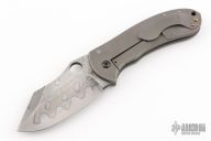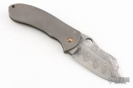 This Left Handed Dao framelock from Burchtree Bladeworks features a hand rub satin finished blade with a nice hamon and a thumbhole. The handle has a tumbled titanium frame with matching tip up clip, notched anodized titanium backspacer. Nice detent, lockup and blade seating. Comes with a zippered case. Excellent condition.