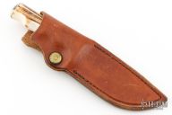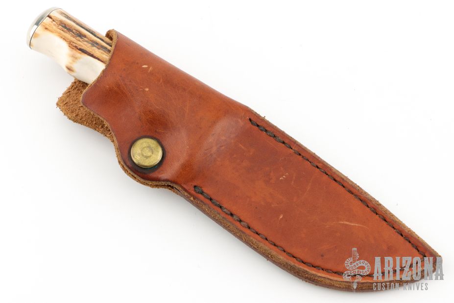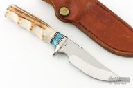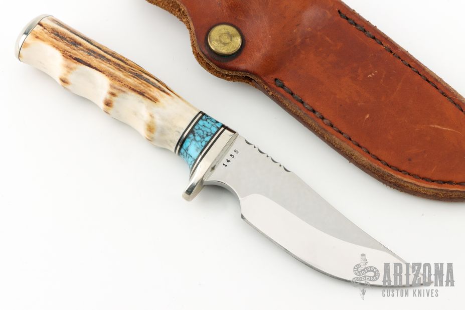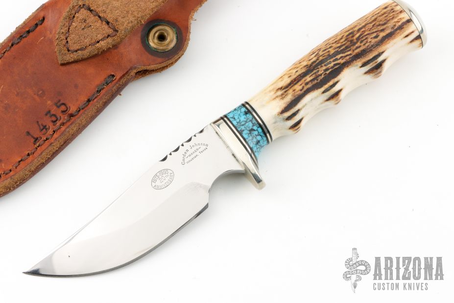This knife by Gorden Johnson features a mirror polished blade with fileworked spine, .189" blade stock and 1.22" blade depth, hidden tang construction. The handle has a nickel silver guard and butt, stag grip with turquoise/black/silver spacers. Comes with a brown leather sheath. Has some scuffs, scratches, and patina, excellent condition otherwise. #1435