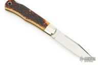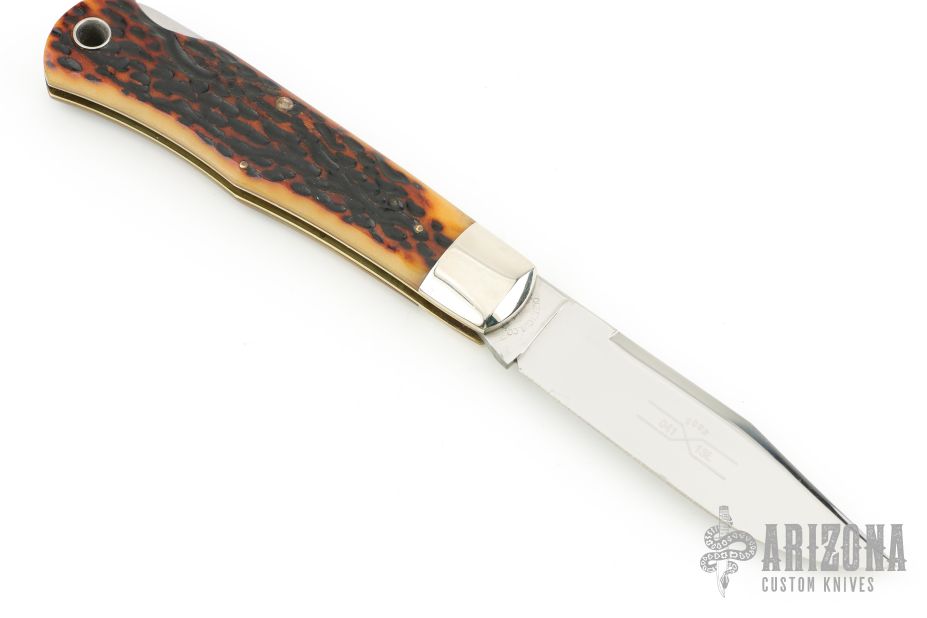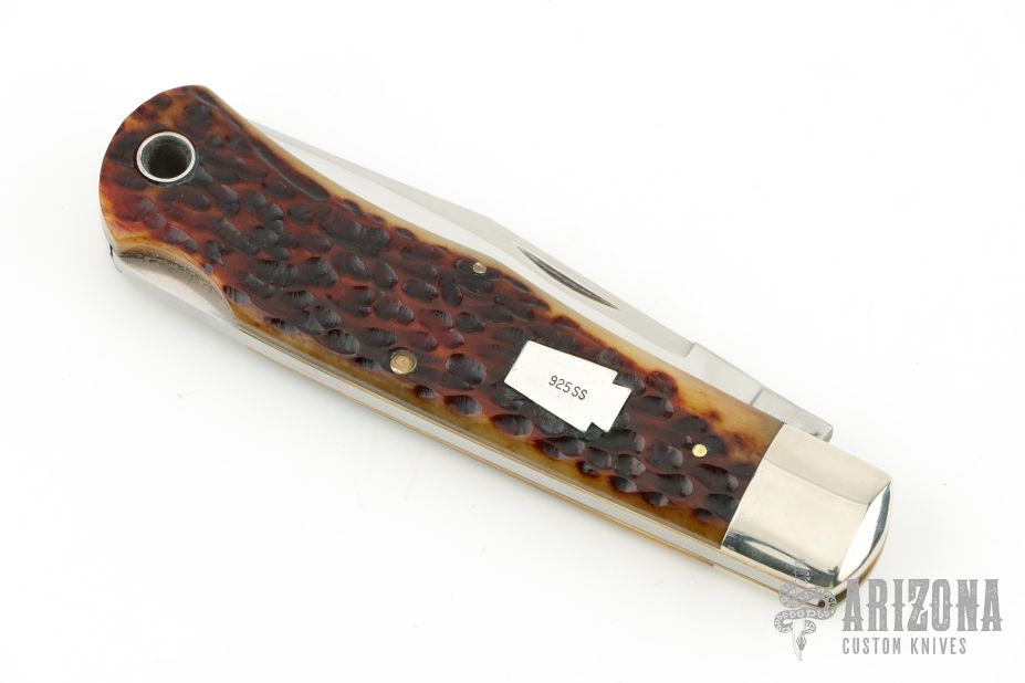 This lockback from Schatt & Morgan features a mirror polished clip point blade with a notched thumbrest and nail nick.  The handle has .925 sterling silver shield, nickel silver bolsters and bone scales over brass liners with steel backspring. Comes with original box and paper. Has a couple light scratches, otherwise Excellent Condition.