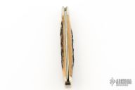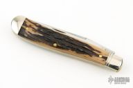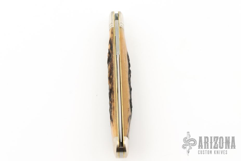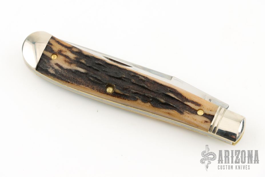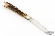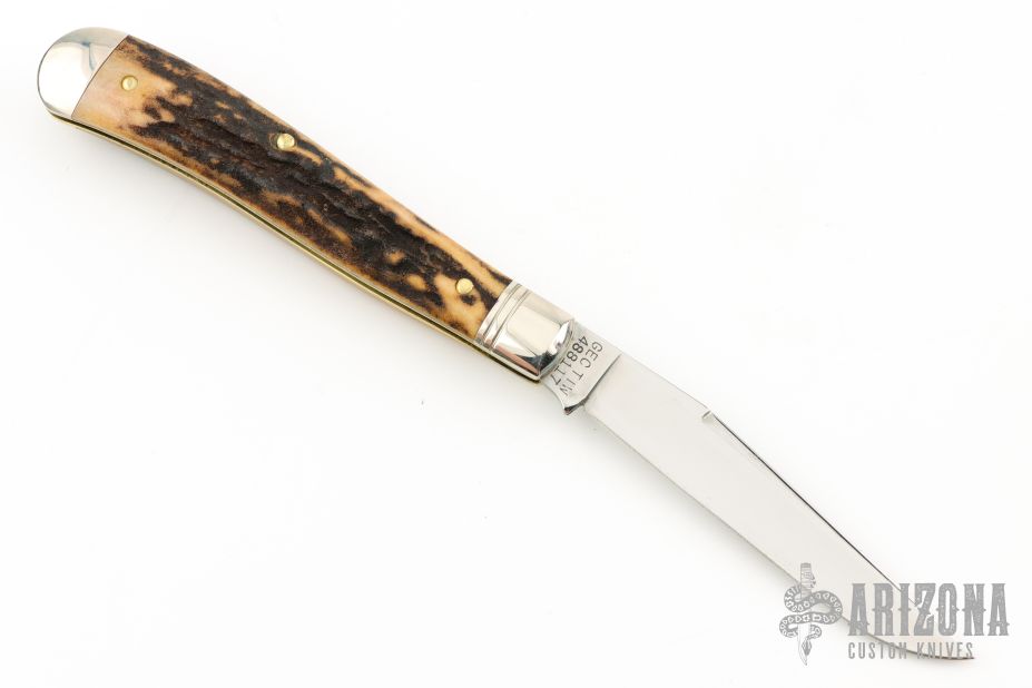 This Trapper by Northfield Knives/Great Eastern Cutlery features a satin finished blade with nail nick. The handle has nickel silver bolsters and butt, horn covers, brass liners, and a stainless steel spring. Has half-stop. Comes with original tube. Excellent condition. 296 made