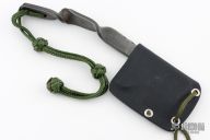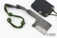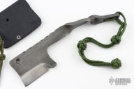 This custom cleaver features an acid etched finish and satin grinds. File work on spine and twisted steel handle with Mil-Spec Kermandle hand tied lanyard. 1/4' blade stock and 2 1/4" blade depth. Comes with a kydex sheath. Has some light scuffs and scratches, great condition otherwise.
