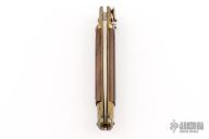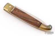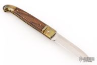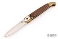 This lever lock auto by AB Italy features a spear point satin finished blade with false top edge. The handle has brass bolsters, front and rear, wood scales, brass liners, stainless steel backspacer. Has some light scratches, and patina, otherwise Excellent condition.