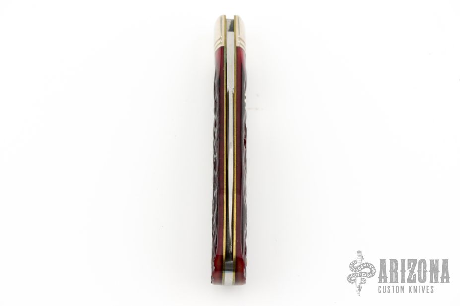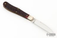 This knife by Great Eastern Cutlery features a polished wharnecliffe blade with a nail nick.  The handle has fluted nickel silver bolsters with red wine jigged bone covers with oak leaf nickel silver escutcheon, brass liners, steel spring.  Comes with original packaging. Excellent condition.