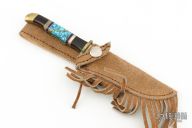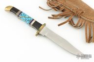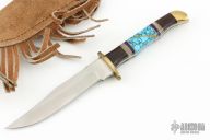 This Custom Hunter by Doris Yazzie features a satin finished blade with .105" blade stock and .758" blade depth, full tang construction. The handle has a brass guard and rear bolsters, ironwood/lapis/pearlex/turquoise/brass scales. Includes a brown leather sheath. Has a few light scratches, otherwise excellent condition. "DY - Navajo" on the blade.