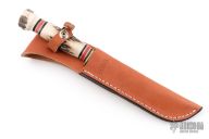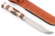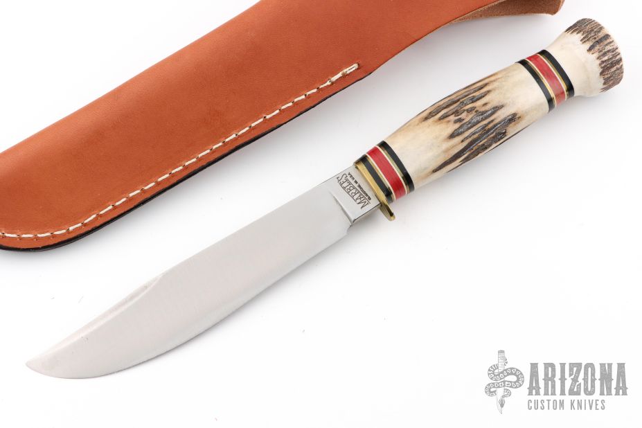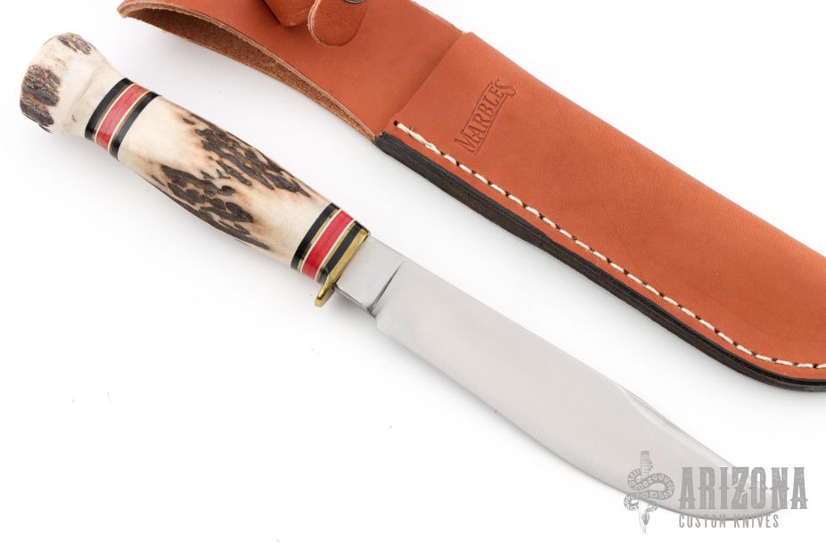 This Expert II by Marbles was made in Gladstone Michigan. It features a satin finished blade with .214" blade stock, 1.089" blade depth, hidden tang construction. The handle has a brass guard, stag grip, stag pommel, black/brass/red/white spacers. Includes a brown leather sheath and original box. Excellent condition.