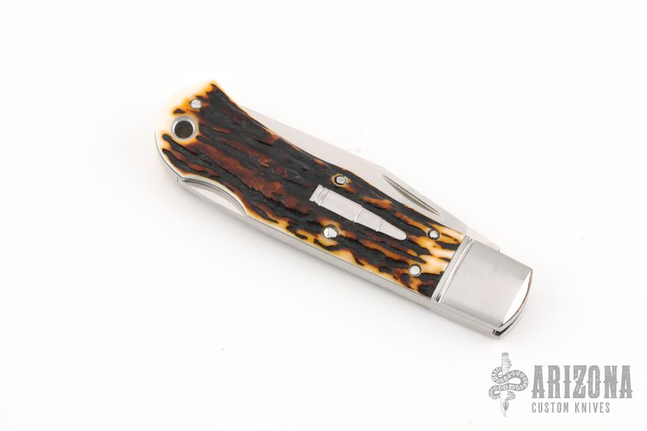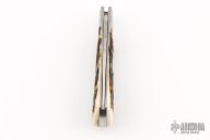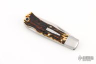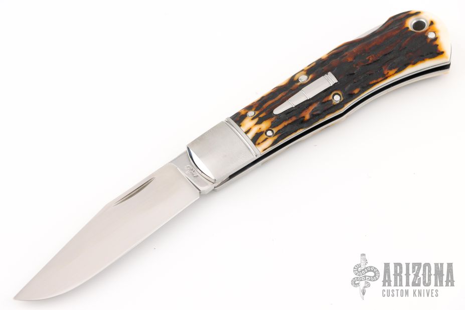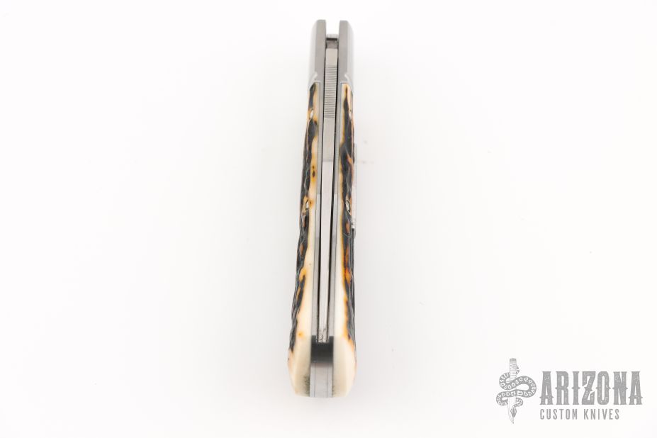 This Mini Remington 1306 Lockback by Ryuichi Kawamura features a hand rub satin finished blade with mirror polished flats, notched thumbrest and a nail nick. The handle has fluted stainless steel bolsters with integral liners liners, stag covers with stainless steel bullet escutcheon, stainless steel lockbar. Nice solid lockup with a nice snap, and nice blade seating. Comes with a cardboard box. Excellent condition. This piece shows no signs of use or carry. There may be knives as nice as this, and more expensive than this, but there aren't any better, that is for sure!