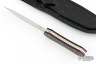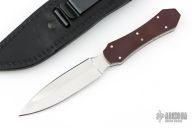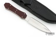 This boot dagger features a mirror polish dagger blade, .127" blade stock and 1.930" blade depth, full tang construction. The handle has pinned wood covers with white liners. Comes with a leather sheath, that does not match the knife. Knife has been re-handled, and file worked by Ken Metsala. Has some scuffs and scratches, good condition otherwise.