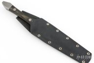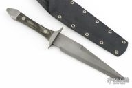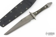 This fighter by Van Voorhies features a bead blasted blade with sharpened top edge, .124" blade stock and 1.318" blade depth, full tang construction. The handle has stainless steel guard and rear bolsters, black linen micarta scales. Comes with a kydex sheath. Has a couple light scuffs and a couple small spots on the ricasso, otherwise excellent condition.