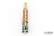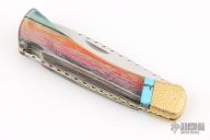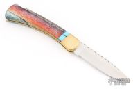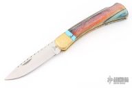 This Model 110 features a satin finished clip point blade with nail nick. The blade spine and spring are file worked. The handle has textured brass bolsters and mexican blanket micarta covers and stainless steel spring. Comes with original box, papers and sheath. Also includes COA. Excellent condition.