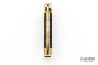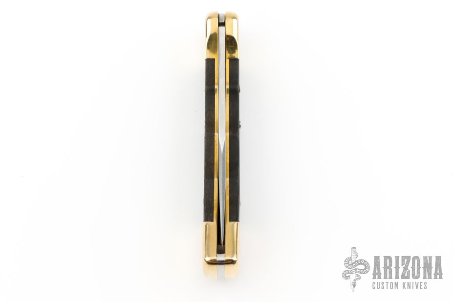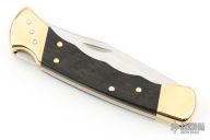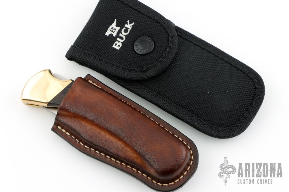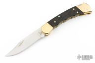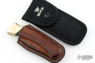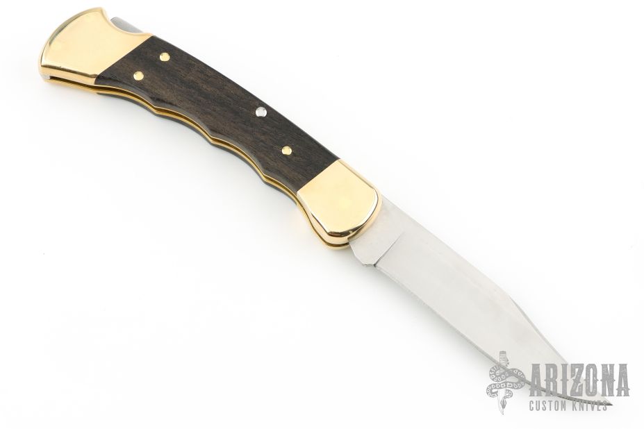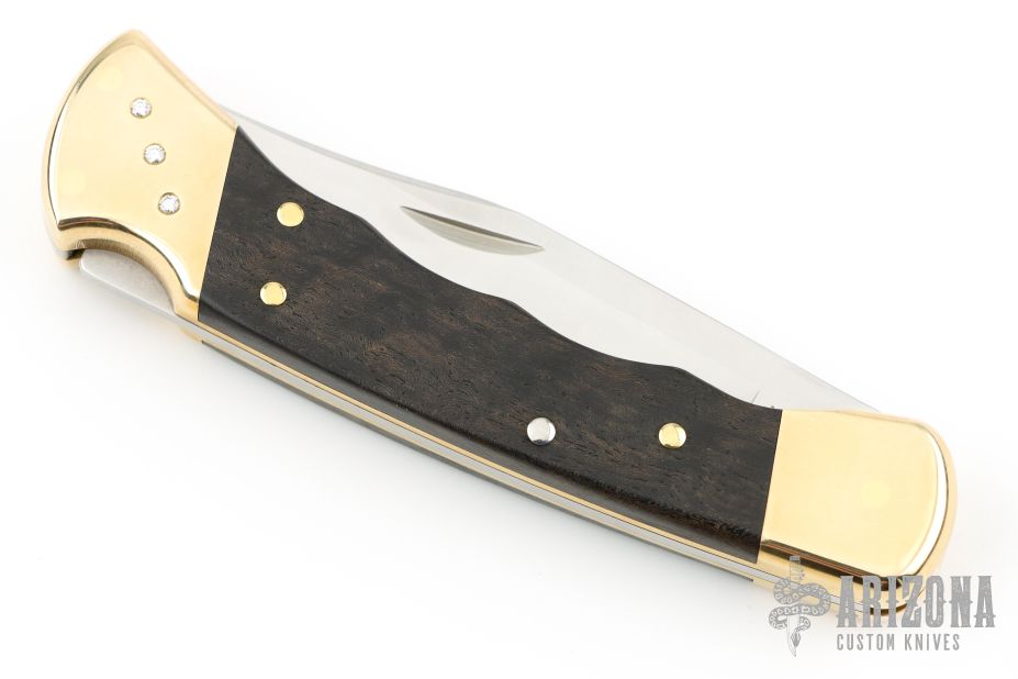 This Buck 110 "folding hunter" features a satin finished clip point blade with nail nick. It has wood scales, brass bolsters and frame. Comes with original sheath, and custom leather belt sheath. Has three diamonds inlaid on the rear bolster. Has a coupl light scratches, excellent condition otherwise.