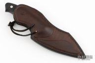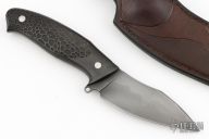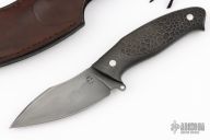 This Knife by Mariano Yannoni features a drop point/up swept blade with nice hamon, notched thumbramp, false top edge, .136" blade stock and 1.293" blade depth, full tang construction. The handle has carved and pinned carbon fiber scales. Comes with a brown leather sheath, and Maker'scase. New from maker!