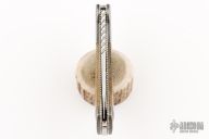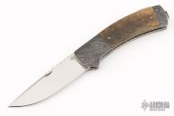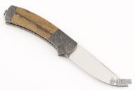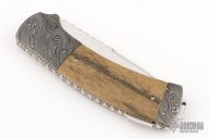This lockback by Buddy Weston features a mirror polished blade with fileworked spine and nail nick. The handle has Damascus bolsters, giraffe bone scales, fileworked nickel silver liners with jeweled interiors, fileworked stainless steel backspacer with checkered lock release, lanyard hole at the butt. Nice lockup and blade seating. Comes with a zippered case. Excellent condition.