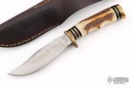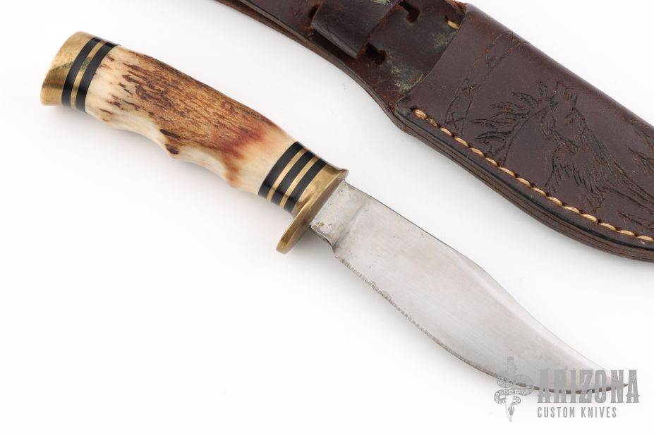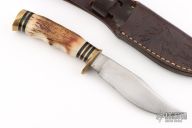This knife by Tokar Knives features a hand rub satin finished blade with false top edge, .165" blade stock and 1.010" blade depth, hidden tang construction. The handle has a brass guard and butt with a stag grip, black/brass spacers. Comes with a hand tooled brown leather sheath. "45BS-002" on the blade. Has some light scratches, otherwise good condition.