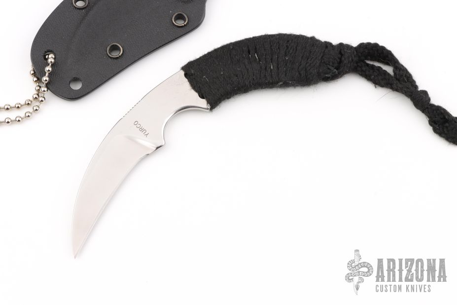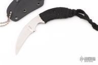 This Claw by Mickey Yurco features a satin finished blade with notched thumbrest, .129" blade thickness and .810" blade depth, full tang construction. The handle has black paracord wrap. Comes with a kydex sheath. Excellent condition.