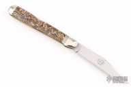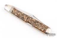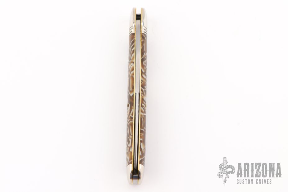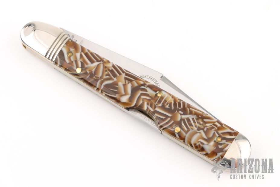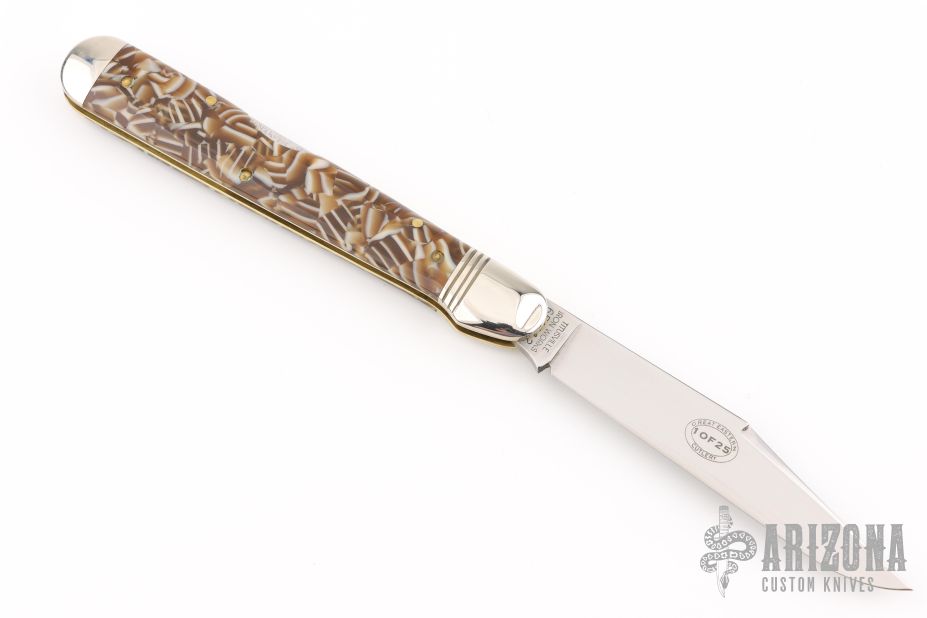 This Lockback by Northfield Knives features a mirror polished clip point blade with nail nick. The handle has nickel silver pinched and threaded bolsters, Pheasant Feather Acrylic covers with a nickel silver escutcheon, brass liners and pins. Comes with original tube and COA. Excellent condition.