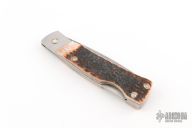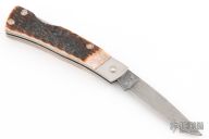 This lockback folder by Case knives features a Damascus drop point blade with nail nick. The handle has stainless liners, spring, and stag covers. Has some light scratches, and patina but otherwise the knife is in excellent condition for its age.