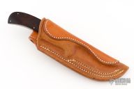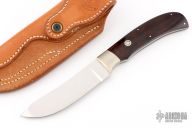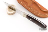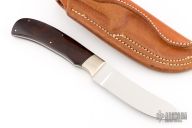 This knife by W.H. Muth features a mirror polished blade with .163" blade stock and 1.020" blade depth, full tapered tang construction. The handle has dovetailed nickel silver bolsters, desert ironwood burl scales with nickel silver pins and makers mark on the small escutcheon. Comes with a brown leather sheath. Excellent condition.