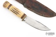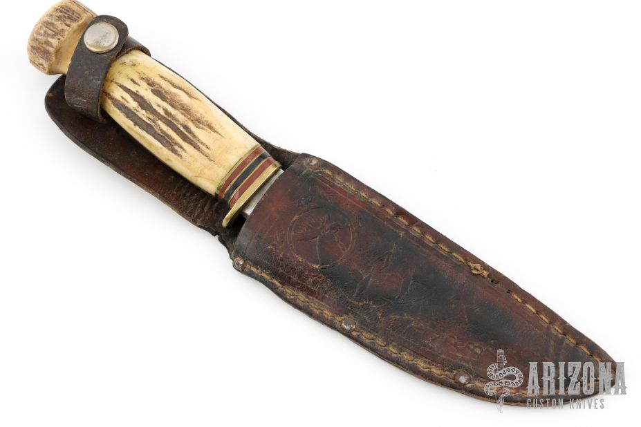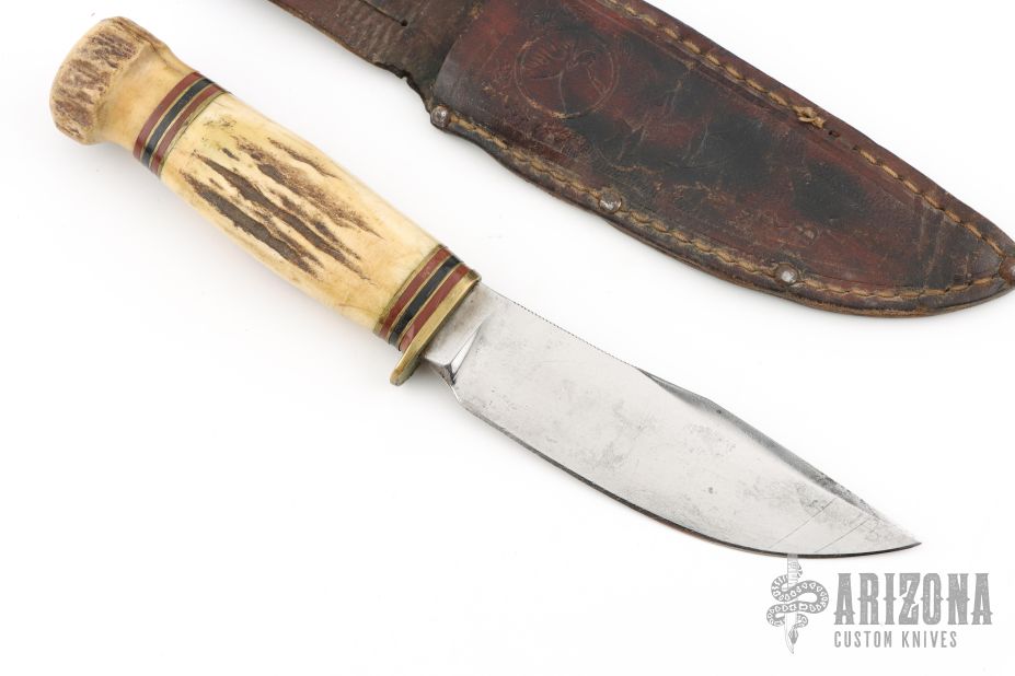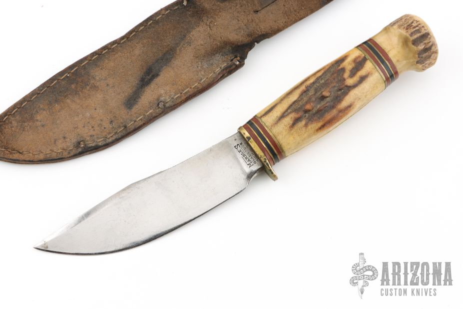 This knife by Marbles features a polished clip point blade with .173" blade stock, 1.135" blade depth, hidden tang construction. The handle has a brass guard, stag grip, stag pommel, black/brass/red spacers with tang nut. Includes a brown leather sheath. Has patina and scratches, has been used and sharpened, otherwise great condition for its age.