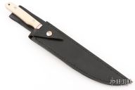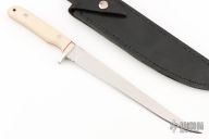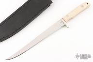 This Fillet Knife by John Harbuck features a mirror polished blade with fileworked ricasso, .128" blade stock and .988" blade depth, full tang construction. The handle has a nickel silver guard with ivory paper micarta scales and nickel silver pins and red liners. Comes with a black leather sheath. Has some light scratches, otherwise excellent condition.