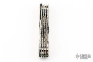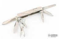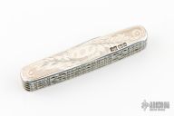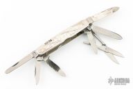 This vintage slipjoint by Stan Shaw features mirror polished blades with nail nicks. All the blades have fileworked spines. Drop point sterling silver blade, drop point steel blade, drop point pen blade, wharncliffe blade with sharpened front, clip point pen blade, and a file with cuticle blade. The handle has engraved sterling silver covers, coin edged sterling silver liners, polished and fileworked steel springs. Has some light scratches, otherwise excellent condition. Very classy piece.