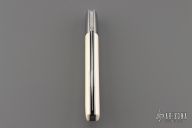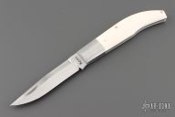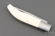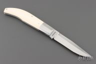 This Flush Joint Slipjoint Prototype by Daniel Keown features a hand rub satin finished blade with nail nick. The handle has 416 stainless steel bolsters with integral liners, mammoth ivory covers, stainless steel spring, stainless steel pins. Has half-stop, flush in all positions. Comes with a zippered case. Excellent condition.
