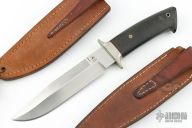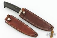 This Fighter by Tom Mayo features a hand rub satin finished blade with a sharpened top edge, .301" blade stock and 1.461" blade depth, hidden tang construction. The handle has a nickel silver guard, black linen micarta grip with a mosaic pin and lanyard hole. Probably one of a kind. Comes with two brown leather sheaths. Has some scratches, has been reshaprened, otherwise good condition.