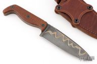 The blade was produced in the Baker Forge and Tool magic dungeon and it is a Wavy Go Mai with an 80CrV2 Core and a 15N20\1084 damascus side with a wavy copper shim in between. The handle is made out of Jute Micarta with a hammered brass liner. The Knife is a takedown construction which enable the enduser to take it apart for cleaning or applying acid to the blade for refreshing the finish.
