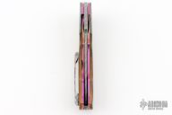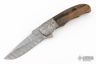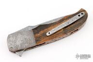 This LL-BB by George Muller features a Damasteel blade with false top edge and flipper tab. The handle has Gibeon Meteorite bolsters, mammoth ivory scales, anodized titanium liners, segmented Damascus backspacer, Damascus tip up clip. Comes with COA, zipper case, and box. Features IKBS. Nice detent, lockup and blade seating. Excellent condition.